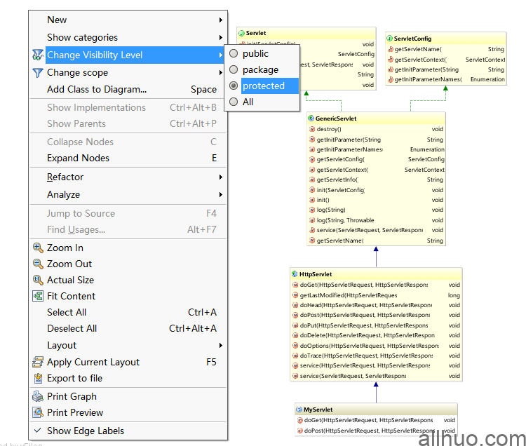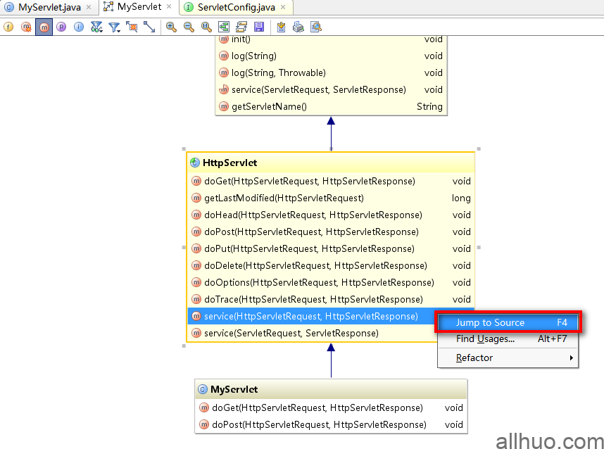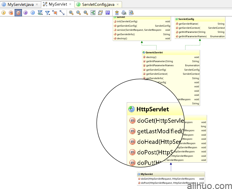 然后你就会得到如下图所示的继承关系图形,以自定义的Servlet为例: